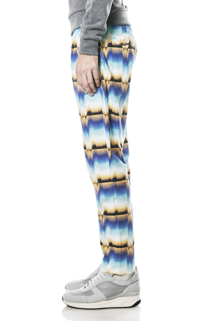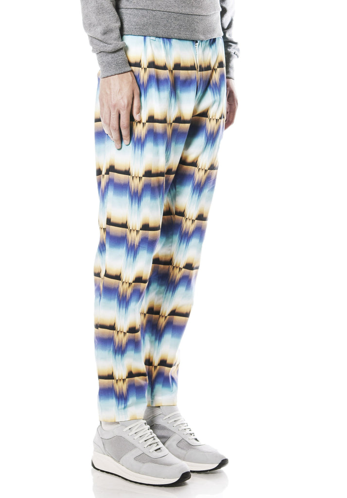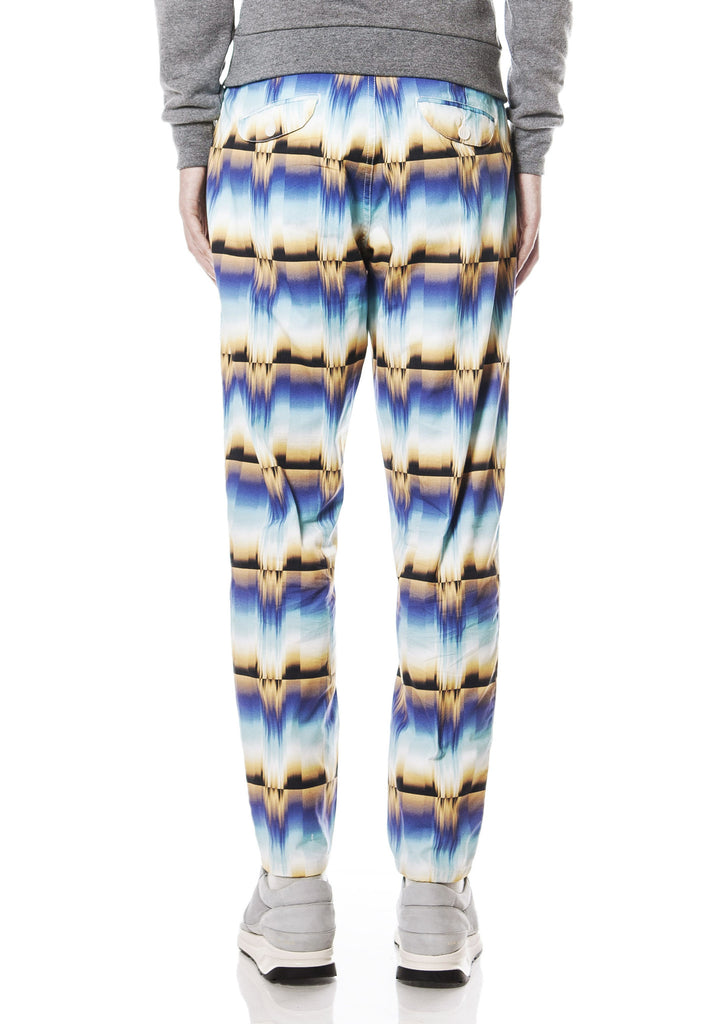 PRINTED COTTON TWILL TROUSERS WITH RELAXED TAPERED FIT WITH PLEATED WAIST. FRONT STRAIGHT POCKETS AND TWO BACK FLAP POCKETS WITH BUTTON CLOSURE. TEXTILE ART BY MANUEL FERNANDEZ.