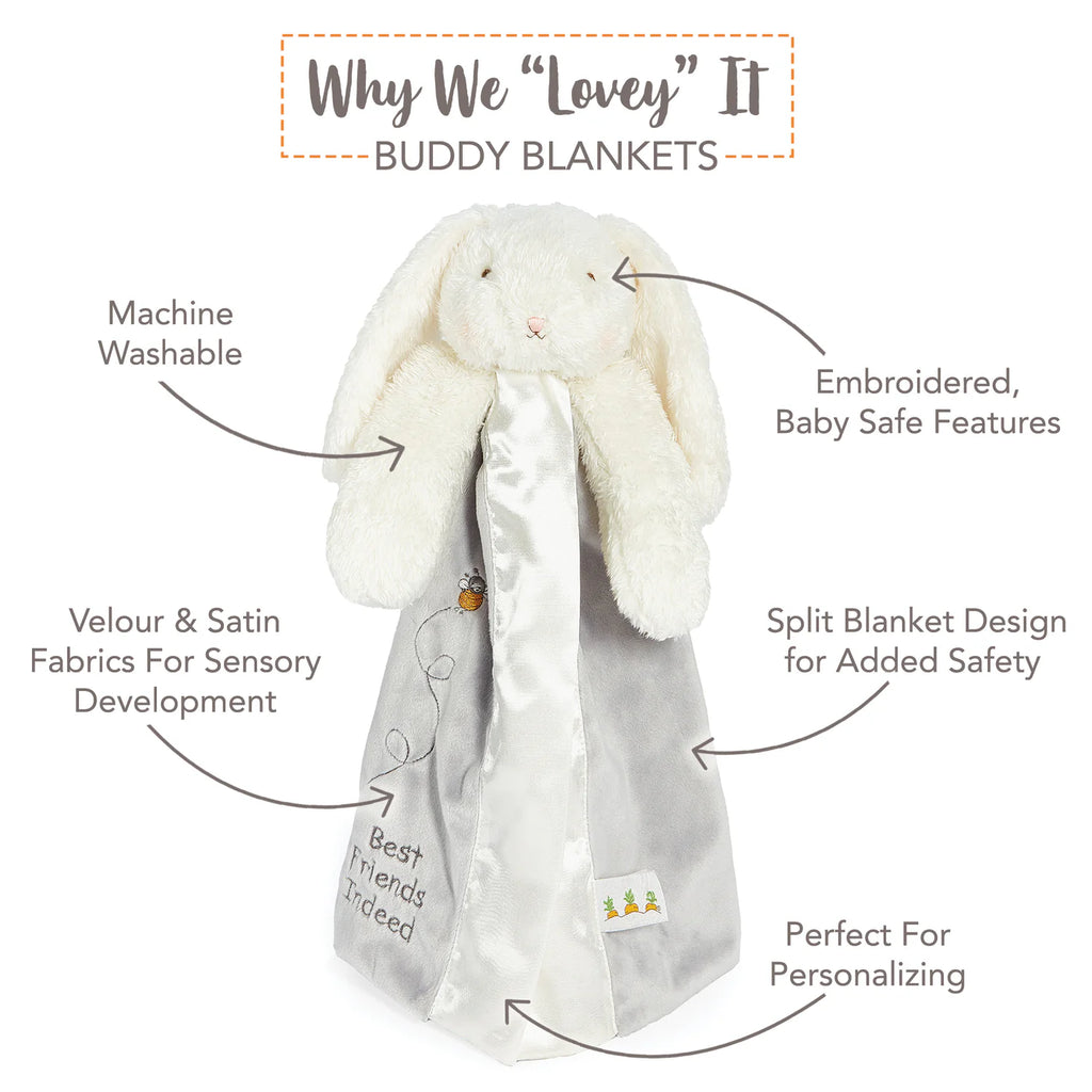 BUNNIES BY THE BAYBloom has a white plush floppy eared bunny stuffed animal head and arms with a handcrafted, baby-safe embroidered face. The snuggly and super soft glacier gray velour split blanket is lined and edged in silky satin for tactile development and soothing and designed with safety in mind.