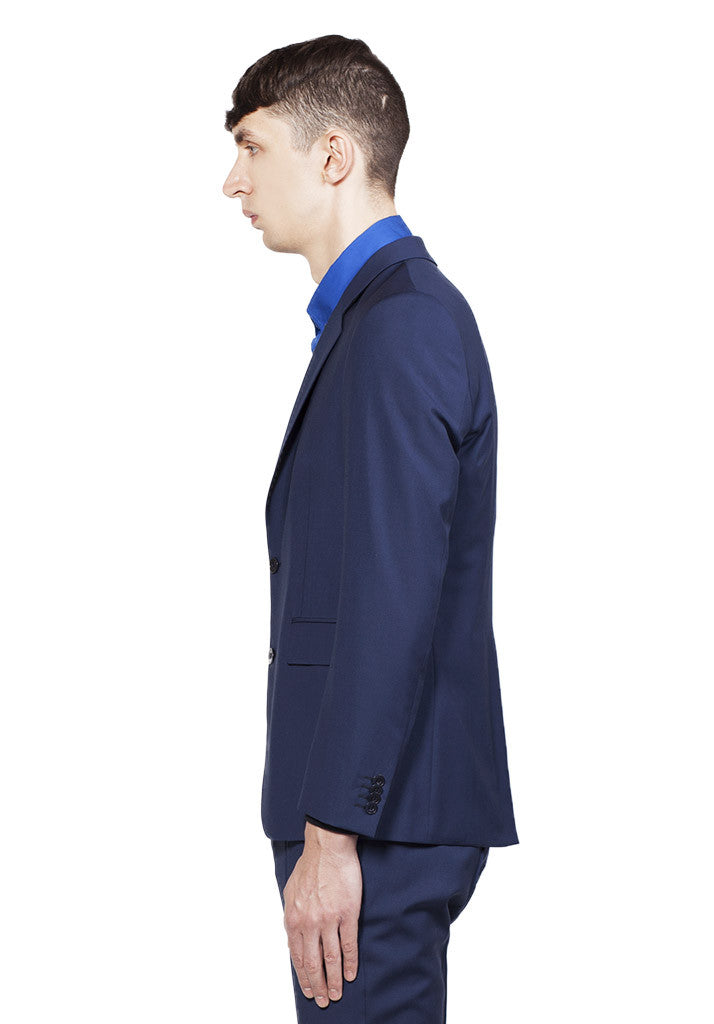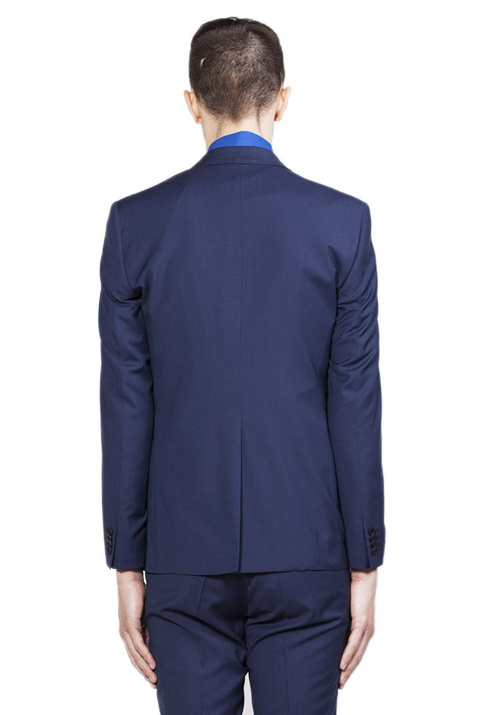 CLASSIC NAVY SUIT JACKET IN WOOL. FEATURES TWO SIDE FLAP POCKETS, TWO FRONT BUTTON CLOSURE, AND FOUR BUTTONS ON CUFF. INCLUDES ONE RIGHT AND TWO LEFT INTERIOR POCKETS.